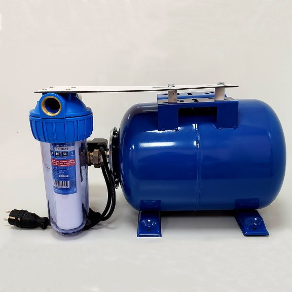 В комплекте: реле давления с манометром, колба фильтра с картриджем, кран, обратный клапан, электрический кабель.