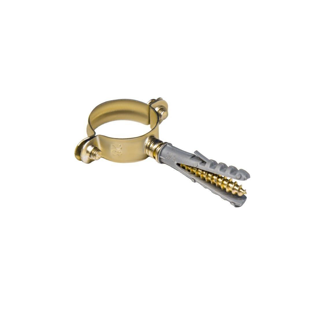Стальной кронштейн используется в качестве неподвижной опоры при креплении к несущей поверхности труб из различных материалов и представляет собой снабженный резиновым уплотнением металлический хомут с гайкой, болтом и дюбелем.