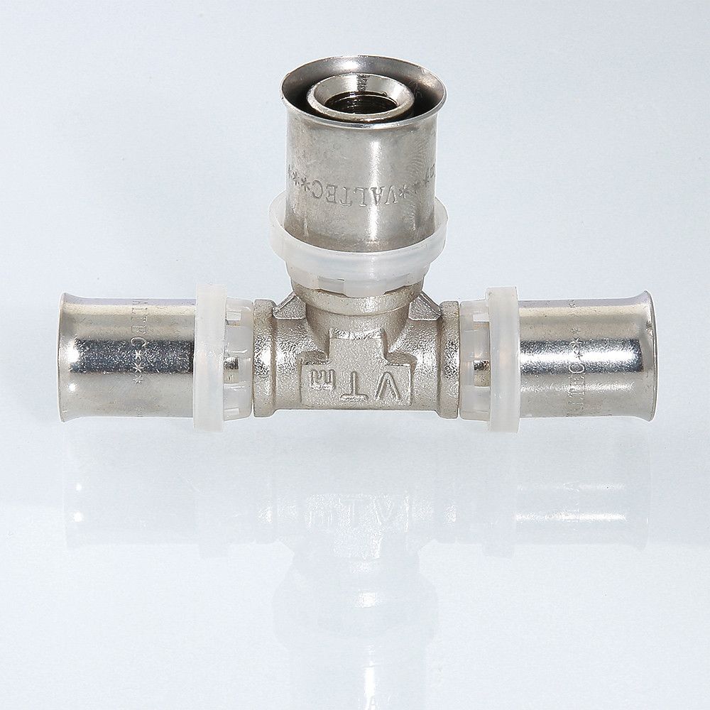 (VTm.231.N) Пресс-фитинг – тройник предназначен для соединения трех труб – металлопластиковых либо из сшитого полиэтилена. Корпус выполнен из сантехнической латуни марки CW617N, уплотнительные кольца штуцеров – из EPDM плотностью 1,22 г/см3, пресс-гильзы – из нержавеющей стали. Нейлоновая обойма выполняет функции фиксатора гильзы, направляющей для пресс-насадок и диэлектрической прокладки, прерывающей контакт между алюминием трубы и латунью корпуса. Конструкция пресс-фитингов VALTEC обеспечивает повышенную пропускную способность, надежность соединений, прочность и термостойкость. Монтаж фитинга производится пресс-инструментом с насадкой «ТН». Типоряд содержит равнопроходные и переходные пресс-тройники.