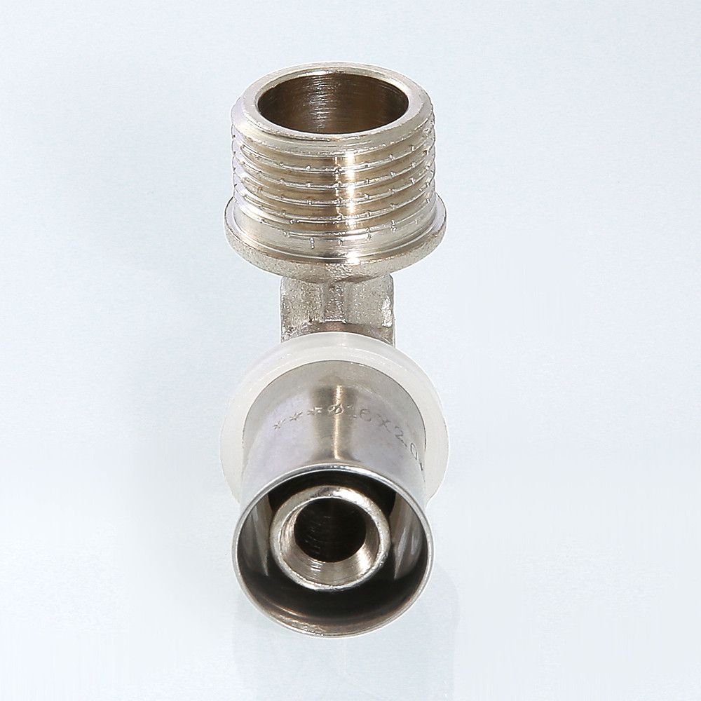 (VTm.253.N) Угловой пресс-фитинг для подсоединения к металлопластиковой трубе (металлополимерная труба) или трубе из сшитого полиэтилена компонента системы с резьбовым подключением. Резьба фитинга – наружная трубная по ГОСТу 6357.