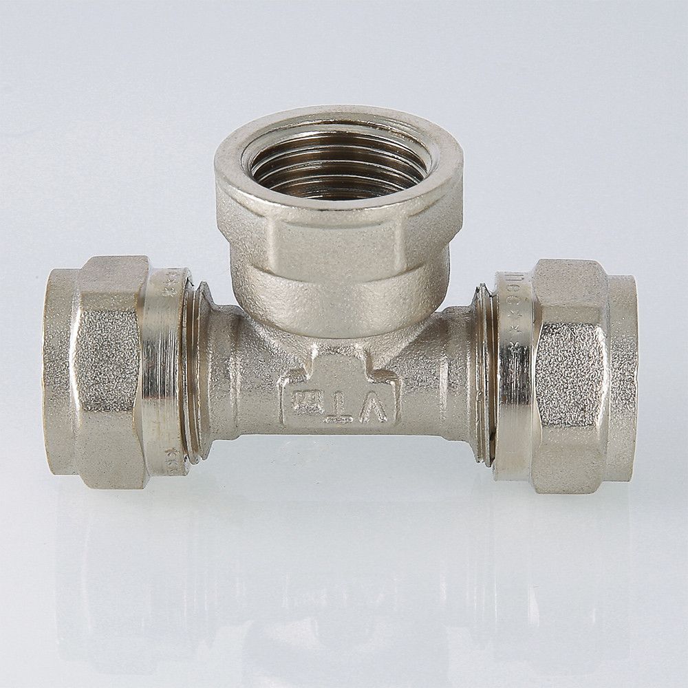(VTm.332.N) Фитинг обжимной – тройник с переходом на внутреннюю резьбу для металлополимерных (металлопластиковых) труб. Резьба фитинга – внутренняя трубная по ГОСТу 6357.