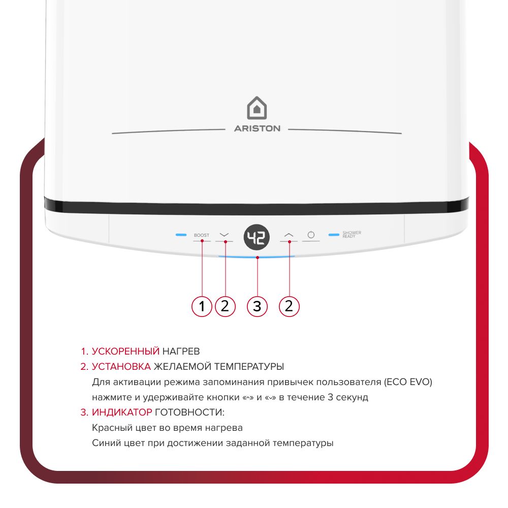 / Функция BOOST - еще больше горячей воды, благодаря попеременной работе двух ТЭНов 1,5 кВт/1,5 кВт и увеличению максимальной температуры до 80 °С